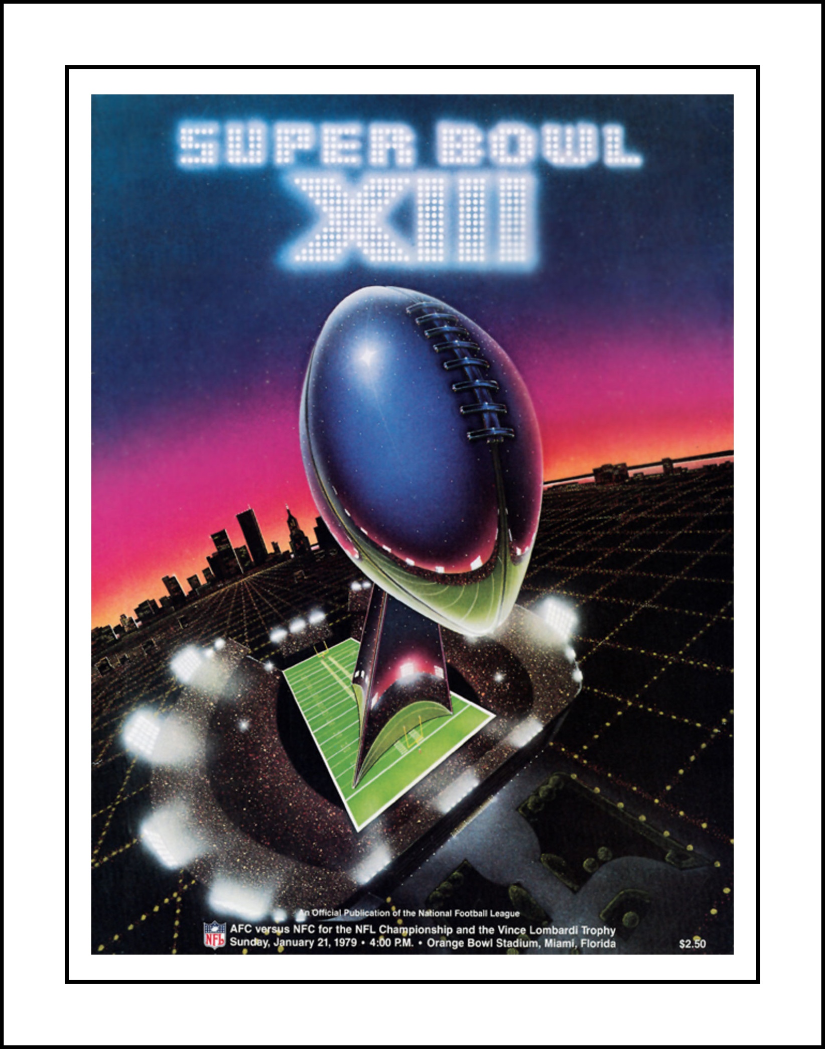 1979 SuperBowl XIII Program Cover Art Poster. In SuperBowl XIII on January 21, 1979, the Pittsburgh defeated Dallas 35-31, behind the stellar play of MVP Terry Bradshaw. Here's a replica cover art poster from that game day program.