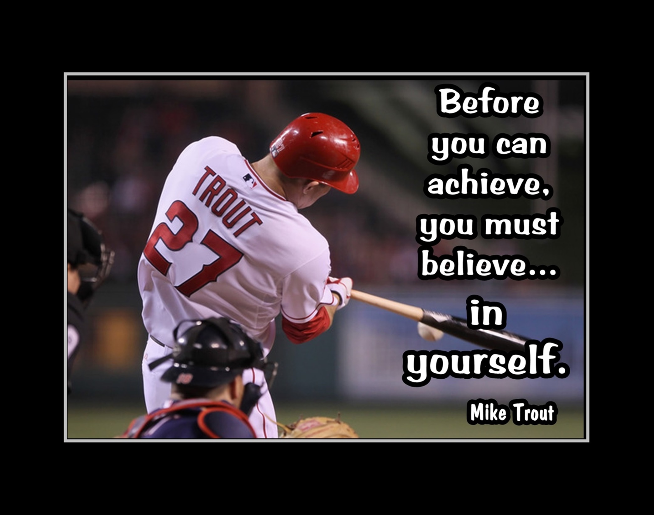 Motivational Baseball & Softball Poster #1. Inspirational Mike Trout "Believe to Achieve" Quote Wall Art is an inspiring, lasting gift for any player. It is certain to motivate and encourage. Suitable for sons, grandsons, daughters, granddaughters, nieces, nephews, boy, girls, friends and teammates.