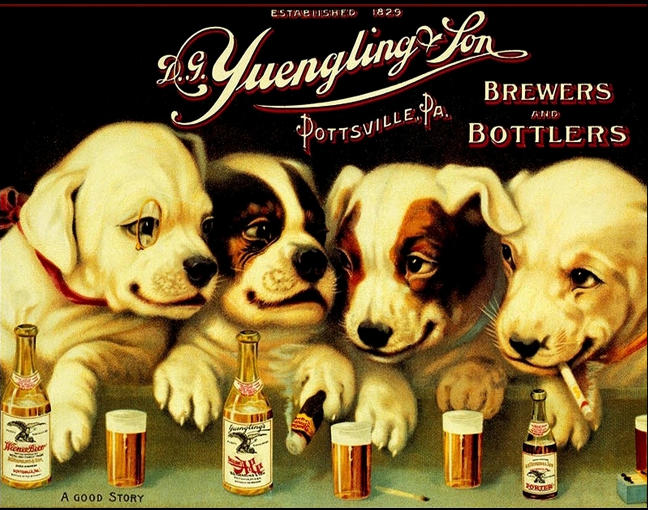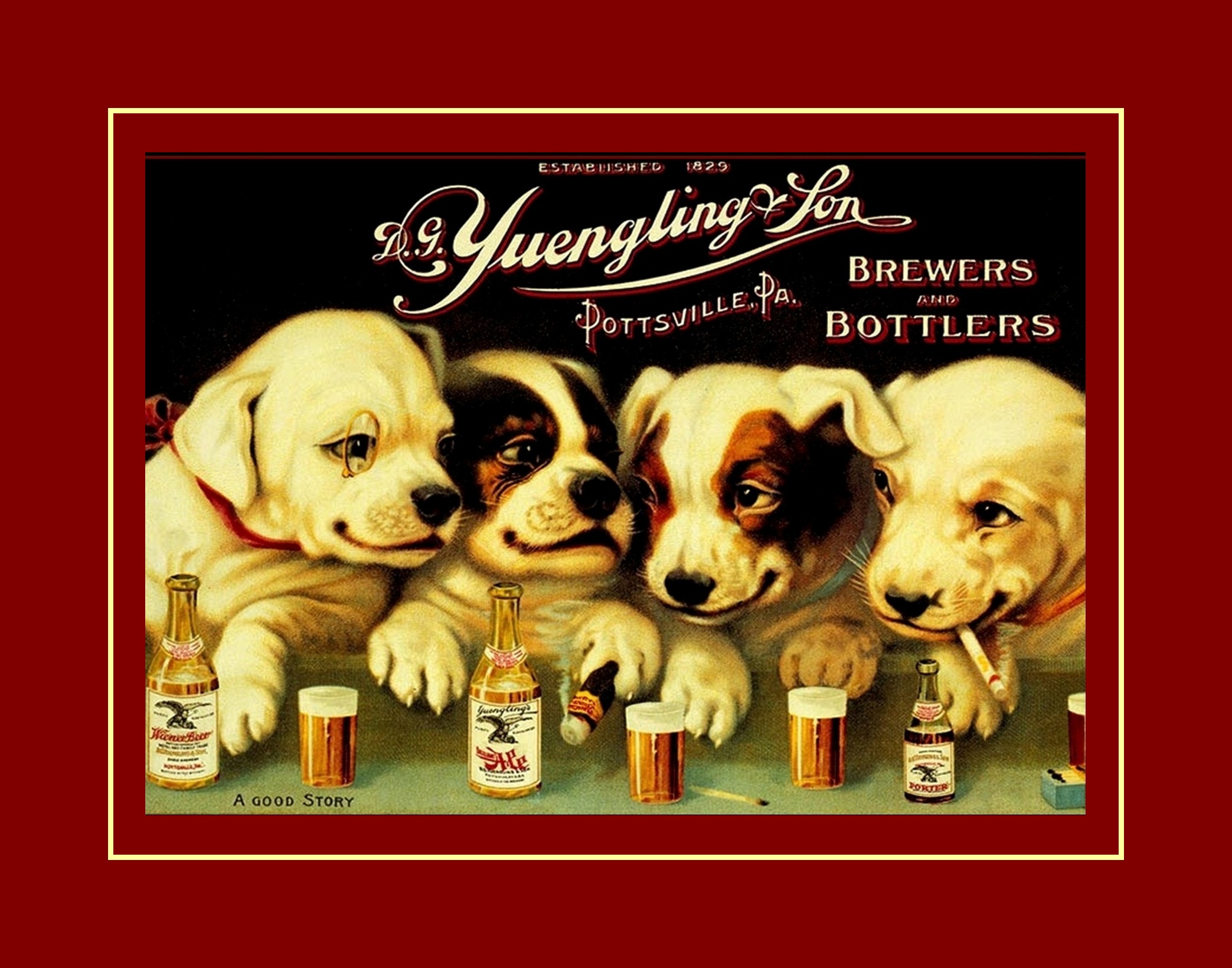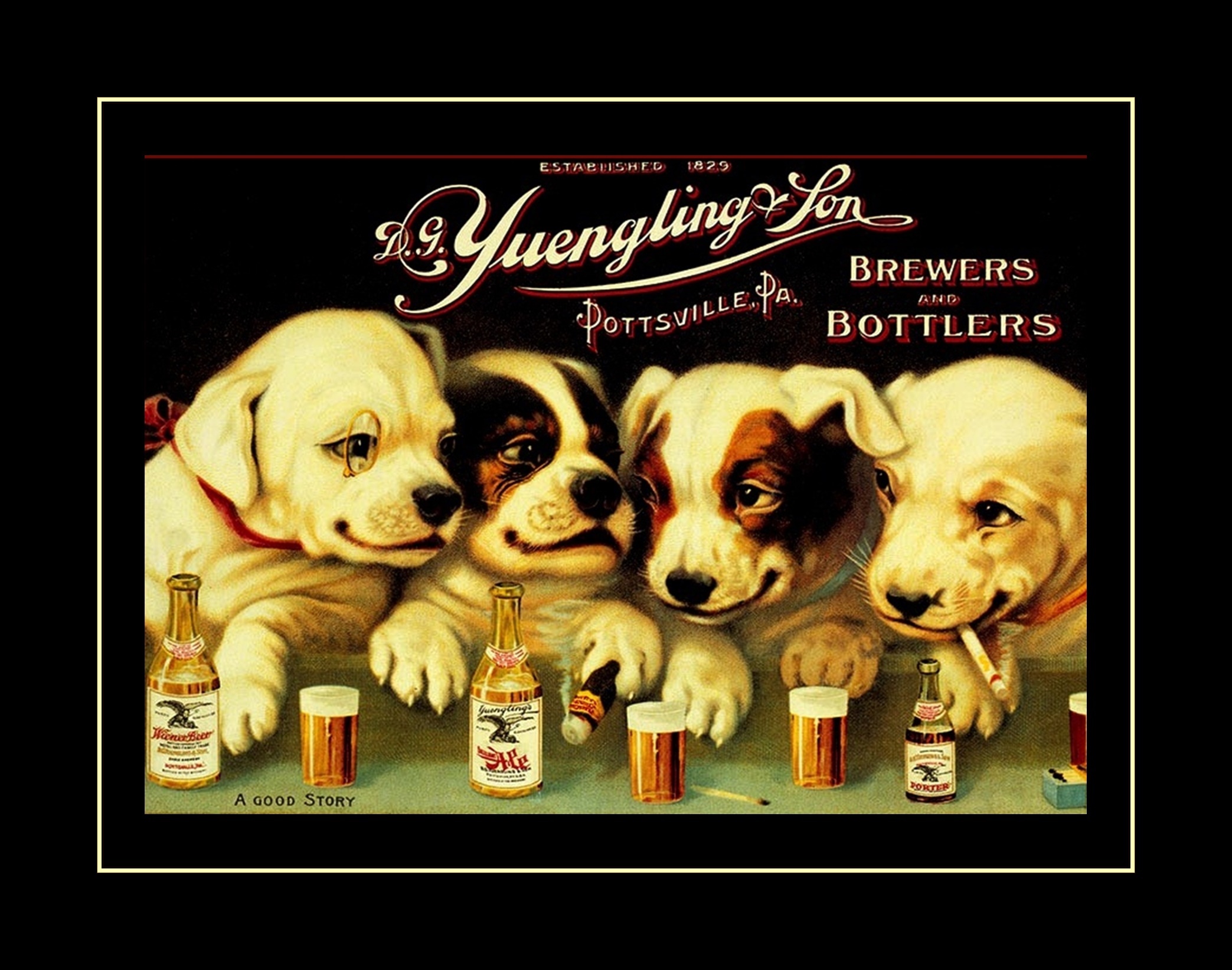 Yuengling Beer "A Good Story" Poster featuring four puppies drinking beer. The original calendar image was created in the early 1900s.